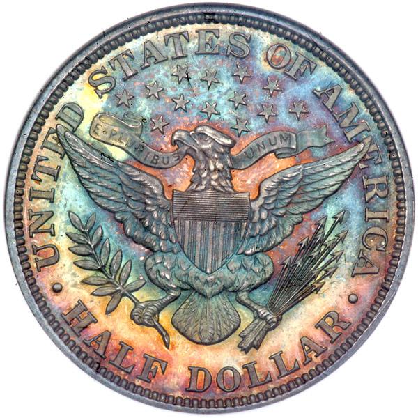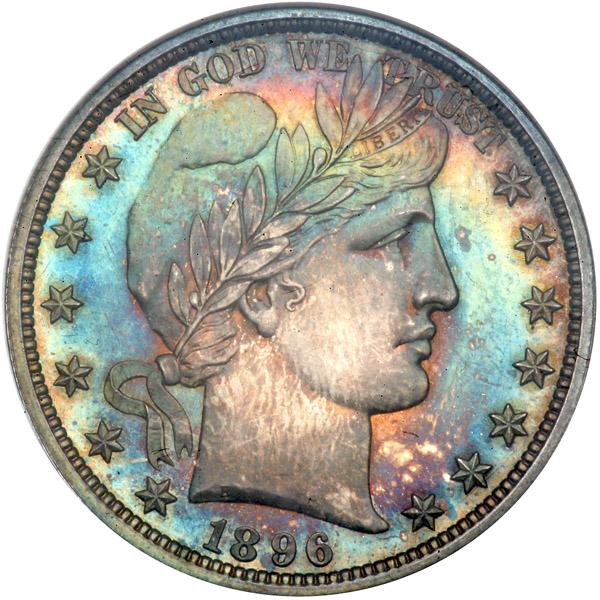 1896 Barber Half Dollar. NGC graded Proof 65. Only 762 Proofs struck. Lovely deep rainbow toning on both sides with strong reliance on beautiful iridescent blue to aquamarine toning. A stunning example! The reverse has more red and amber gold hues, equally vivid and eye-catching.