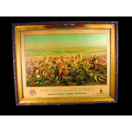 1896 Custers Last Fight Cardboard Sign, Original Frame, Anheuser Busch Brewing Association, St. Louis, MO, some staining around the bottom perimeter otherwise excellent condition, over all dimensions 49 x 39 inches.