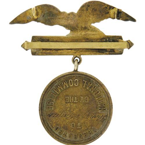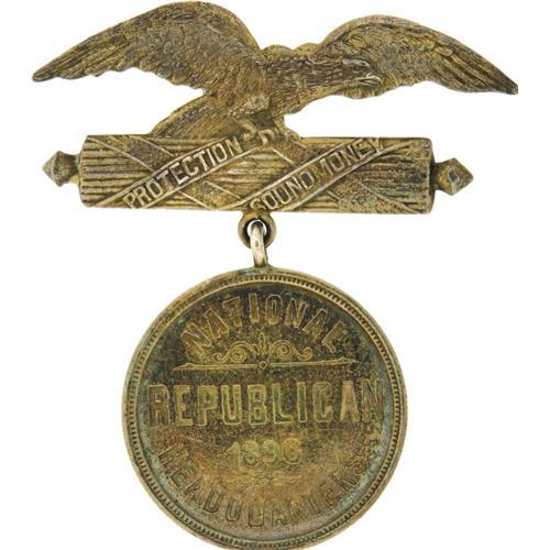 <B>1896 Election: A Unique Badge Presented by the Republican National Committee to Wisconsin Member Henry Clay Payne.</B></I> One side reads "National Republican Headquarters, 1896". The reverse reads "Presented to Henry C. Payne by the National Committee", his name having been engraved in script. The hanger features an eagle atop a horizontal fasces wrapped in a ribbon reading "protection" and "sound money". A substantial and elegant badge in choice condition. Payne was a Milwaukee Wisconsin civic leader and a member of the Republican National committee from 1880-1904. In 1904, he served as chairman, presiding over Theodore Roosevelt's landslide victory. We have never seen this item before. Even the hanger part is a style which seems to have been made for just this particular badge as we have encountered no other example. Pin missing on reverse. Across the lower portion of the hanger on reverse is a bar which suggests that there was originally a ribbon attached, which would have served as a background for the suspended medal. 55mm x 56mm.<BR><BR><b>Shipping:</b> Small Flat (<a target="_blank" href="http://www.heritageauctions.com/common/shipping.php">view shipping information</a>)