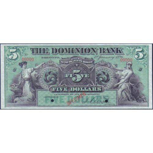 1896 Five Dollars The Dominion Bank Specimen, CH 220-16-02S Serial Number 00000 C, PMG Gem Uncirculated 66 Exceptional Paper Quality