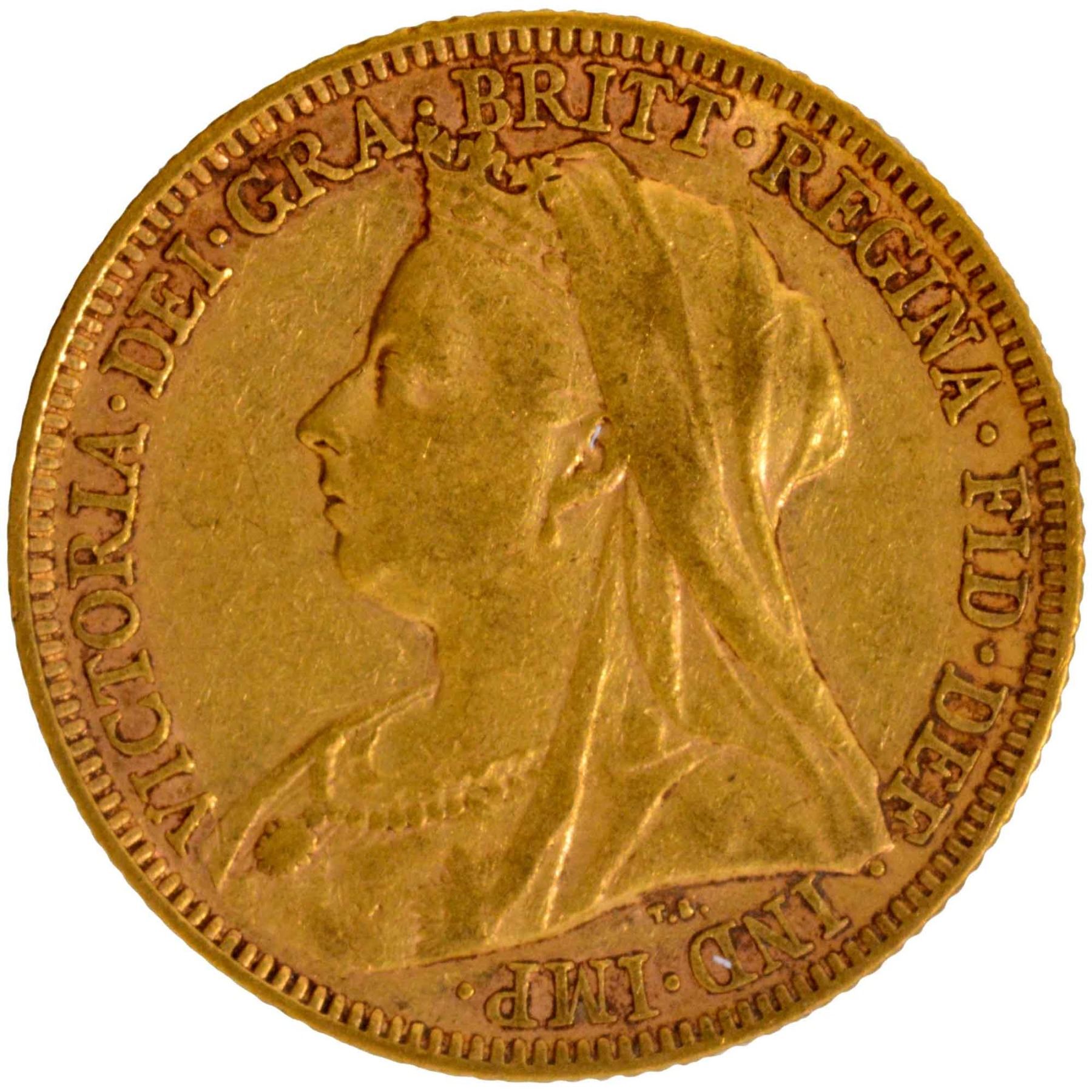 United Kingdom, Victoria Queen(1837-1901),Gold Sovereign,1896, Melbourne Mint,Obv:veiled bust of the queen facing to left,legend around the field,Rev:St. George slaying the dragon, helmet streamer flow from lance to the rim,date 1896 in the exergue,mintmark M at the center of ground-line,7.9g, 22.14mm,(KM # 785),about extremely fine,Rare.