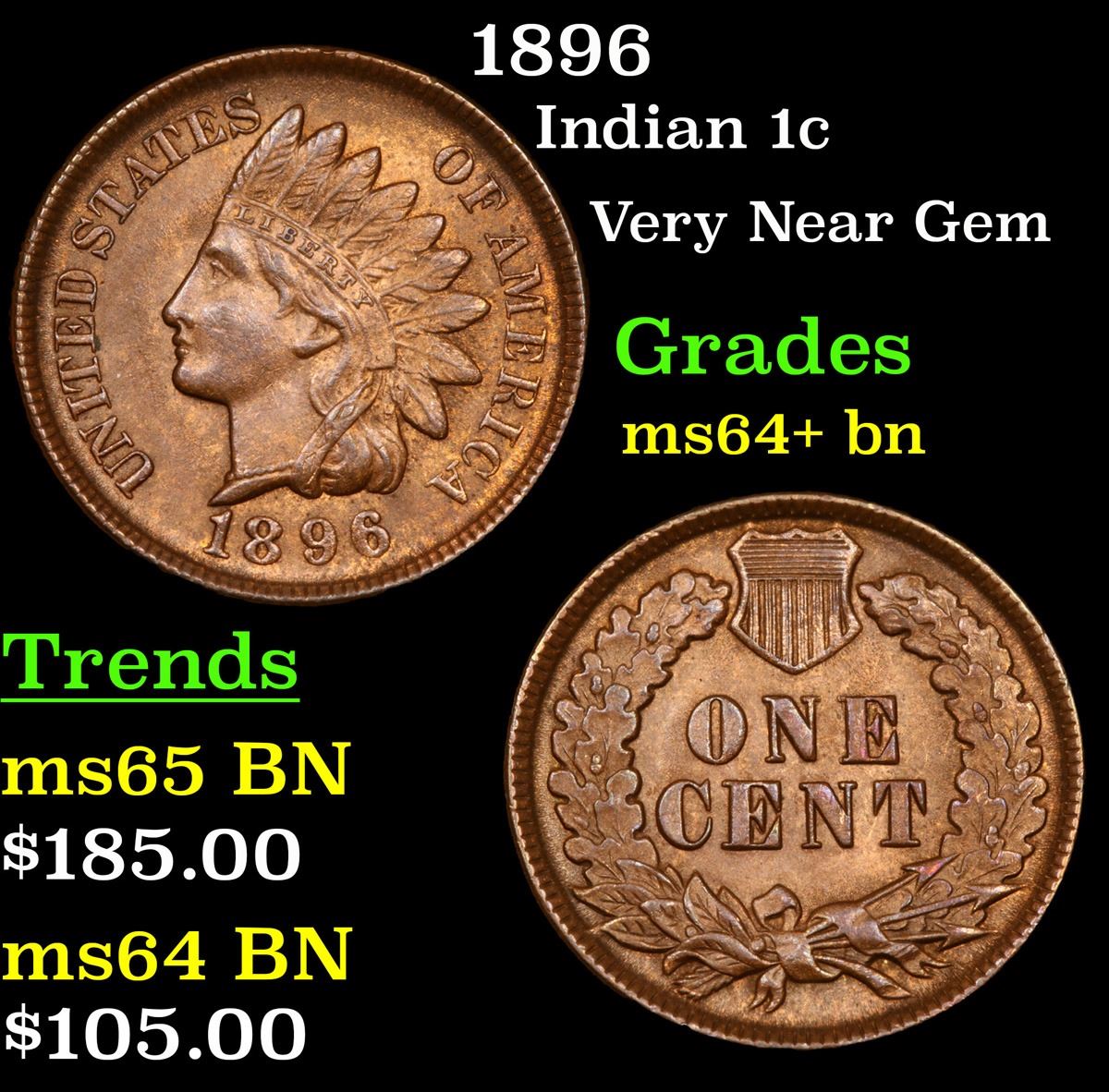 1896 Indian Cent 1c Grades Choice+ Unc BN.