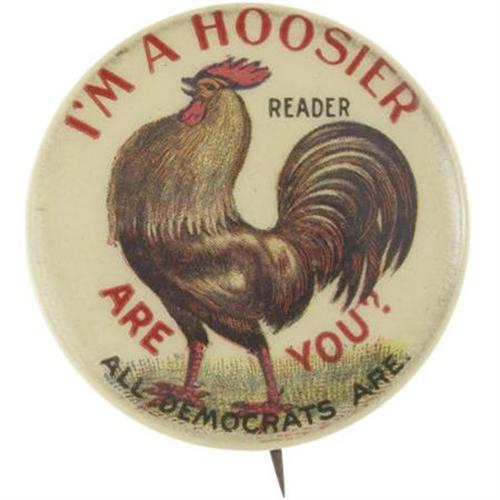 <B>1896 Indiana Hoosier W.J. Bryan Pinback.</B></I> Rare 1 3/8" campaign pin declares "<I>I'M A HOOSIER ARE YOU?"</B></I> around a strutting rooster. In great condition, back marked "Whitehead & Hoag Co. Newark, N.J., U.S.A." <I>From the Norman Loewenstern Collection.</B></I><BR><BR><b>Shipping:</b> Miscellaneous Collectibles, Smal (<a target="_blank" href="http://www.heritageauctions.com/common/shipping.php">view shipping information</a>)