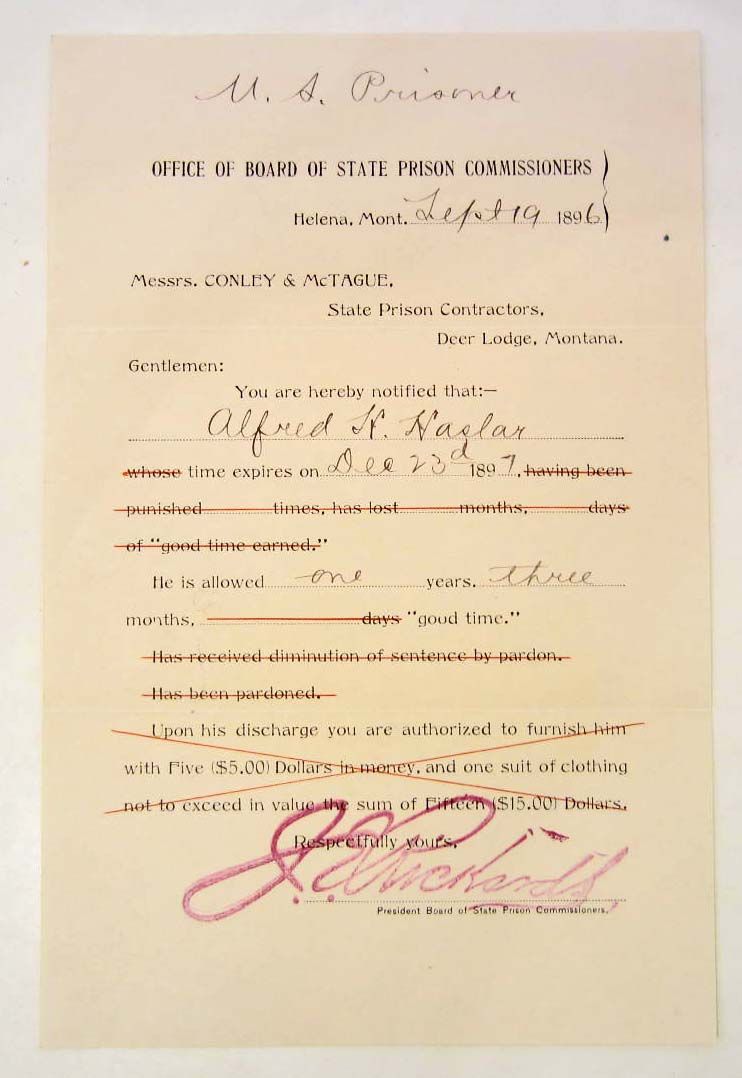 Office of Board of State Prisoners Commissioners Notice to Messrs. Conley & McTague, State Prison Contractors, Deer Lodge, Montana, that Alfred K. Haslars time expires on Dec. 23rd, 1897. He is allowed 1 year 3 months good time.