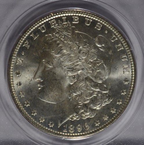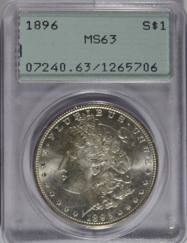 1896 MORGAN SILVER DOLLAR, PCGS MS-63, IN OLD GREEN HOLDER