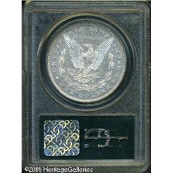 <B>1896<img border='0' src='http://www.heritagecoins.com/images/star.gif' width=10 height=10>$1 MS65 Deep Mirror Prooflike PCGS.</B></I> Deeply reflective and brilliant with slightly hazy surfaces and lightly abraded. Lot:10491
