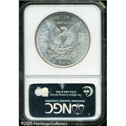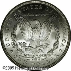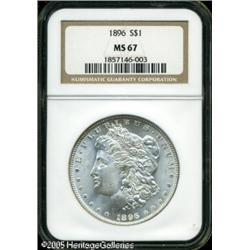 <B>1896<img border='0' src='http://www.heritagecoins.com/images/star.gif' width=10 height=10>$1 MS67 NGC.</B></I> A frosty white coin which shows radiant luster and , a good strike and abundant eye appeal. The surfaces are a delight to study, as for few signs of handling are found. The combined NGC and PCGS population reports tally 44 coins this high with none seen finer of this date. Lot:10489