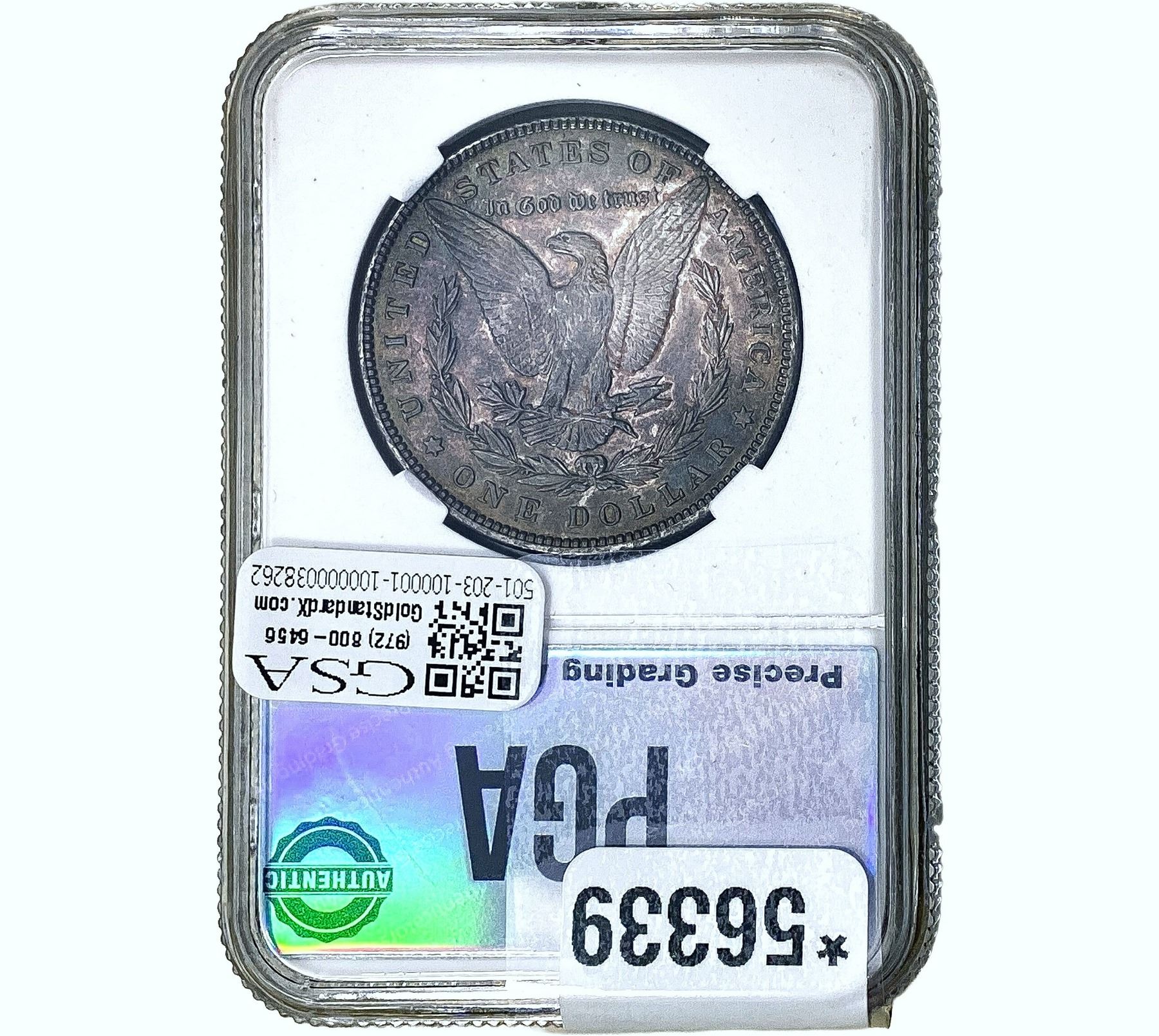 COINS AND CURRENCY LISTED IN GSA’S CATALOG AS GRADED AND ENCAPSULATED BY PCGS, NGC, ANACS, ICG, PCGS CURRENCY, PMG, PCGS BANKNOTE GRADING, CMC OR ANY OTHER THIRD-PARTY GRADING SERVICE ARE LIKEWISE SOLD “AS-IS” EXCEPT AS EXPRESSLY SET FORTH HEREIN. ALL THIRD-PARTY GRADING SERVICE GUARANTEES, INCLUDING AUTHENTICITY, ARE THE SOLE RESPONSIBILITY OF THE THIRD-PARTY GRADING SERVICE AND NOT WARRANTIES OR GUARANTEES OF GSA. BIDDERS SHOULD CONTACT THESE THIRD-PARTY GRADING SERVICES DIRECTLY WITH RESPECT TO ANY CLAIMS OR QUESTIONS THEY MAY HAVE CONCERNING THEIR GUARANTEES AND WARRANTIES. BIDDERS ACKNOWLEDGE AND AGREE THAT AUCTIONEER IS NOT BOUND BY OR LIABLE FOR ANY OPINION OR CERTIFICATION BY ANY THIRD-PARTY GRADING SERVICE. REMOVAL OF A PRODUCT FROM ITS PROTECTIVE CASING OR HOLDER OR ALTERATION OF ANY COIN HOLDER WAIVES ALL RIGHTS CONCERNING THE PRODUCT CONTAINED THEREIN.