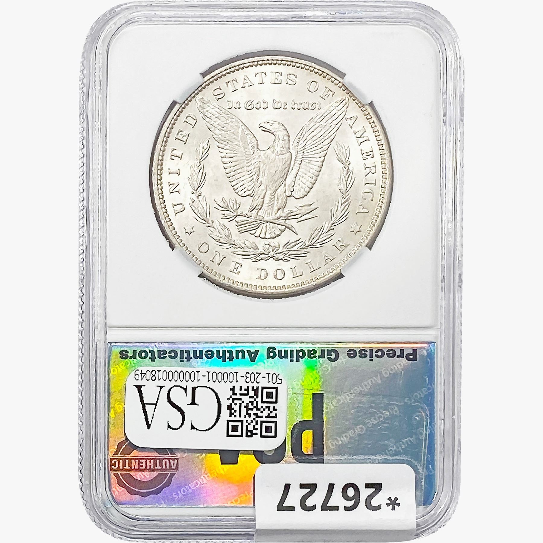 COINS AND CURRENCY LISTED IN GSA’S CATALOG AS GRADED AND ENCAPSULATED BY PCGS, NGC, ANACS, ICG, PCGS CURRENCY, PMG, PCGS BANKNOTE GRADING, CMC OR ANY OTHER THIRD-PARTY GRADING SERVICE ARE LIKEWISE SOLD “AS-IS” EXCEPT AS EXPRESSLY SET FORTH HEREIN. ALL THIRD-PARTY GRADING SERVICE GUARANTEES, INCLUDING AUTHENTICITY, ARE THE SOLE RESPONSIBILITY OF THE THIRD-PARTY GRADING SERVICE AND NOT WARRANTIES OR GUARANTEES OF GSA. BIDDERS SHOULD CONTACT THESE THIRD-PARTY GRADING SERVICES DIRECTLY WITH RESPECT TO ANY CLAIMS OR QUESTIONS THEY MAY HAVE CONCERNING THEIR GUARANTEES AND WARRANTIES. BIDDERS ACKNOWLEDGE AND AGREE THAT AUCTIONEER IS NOT BOUND BY OR LIABLE FOR ANY OPINION OR CERTIFICATION BY ANY THIRD-PARTY GRADING SERVICE. REMOVAL OF A PRODUCT FROM ITS PROTECTIVE CASING OR HOLDER OR ALTERATION OF ANY COIN HOLDER WAIVES ALL RIGHTS CONCERNING THE PRODUCT CONTAINED THEREIN.