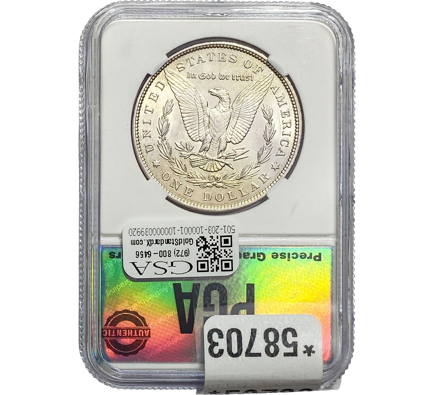 e. Coins sold referencing a third-party grading service are sold “AS IS” without any express or implied warranty, except for a guarantee by GSA that they are genuine. Removal or alteration of the holder, voids all of Bidder’s claims concerning that Product. Certain warranties may be available from the grading services and Bidders are referred to them for further details: Numismatic Guaranty Corporation (NGC), PO Box 4776, Sarasota, FL 34230, www.ngccoin.com/services/writtenguarantee.asp; Professional Coin Grading Services (PCGS), PO Box 9458, Newport Beach, CA 92658, www.pcgs.com/guarantee.html; ANACS, 6555 S. Kenton St., Ste. 303, Englewood, CO 80111; and Independent Coin Grading Co. (ICG), 7901 East Bellview, Ave., Suite 50, Englewood, CO 80111.