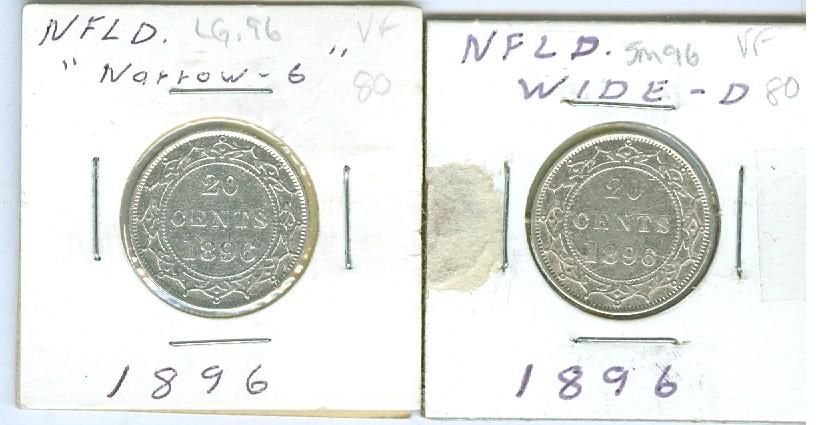 1896 Nfld 20¢. Lot of 2 coins both VF.