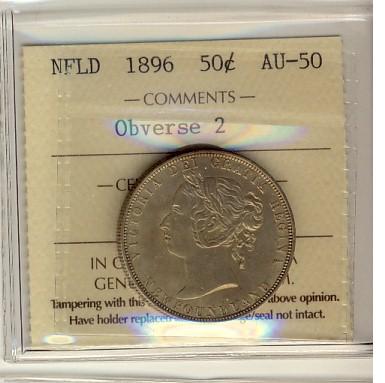 1896 Nfld 50¢ Obv. 2 ICCS AU50. Light lustre with yellow tint.