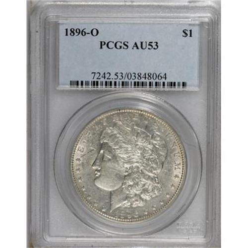<B>1896-O $1 AU53 PCGS.</B></I> PCGS Population (251/2374). NGC Census: (392/2524). Mintage: 4,900,000. Numismedia Wsl. Price for NGC/PCGS coin in AU53: $146. (#7242)<BR><BR><B>Coin Engraver:</B> George T. Morgan<BR><BR><b>Shipping:</b> Coins & Currency (<a target="_blank" href="http://www.heritageauctions.com/common/shipping.php">view shipping information</a>)