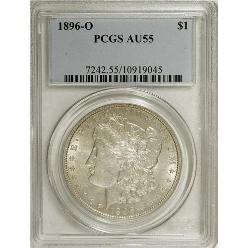 <B>1896-O $1 AU55 PCGS.</B></I> PCGS Population (575/0). NGC Census: (570/1879). Mintage: 4,900,000. Numismedia Wsl. Price for NGC/PCGS coin in AU55: $200. (#7242)<BR><BR><b>Shipping:</b> Coins & Currency (<a target="_blank" href="http://www.heritageauctions.com/common/shipping.php">view shipping information</a>)