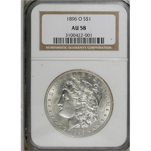 <B>1896-O $1 AU58 NGC.</B></I> NGC Census: (1016/1011). PCGS Population (718/1182). Mintage: 4,900,000. Numismedia Wsl. Price for NGC/PCGS coin in AU58: $360. (#7242)<BR><BR><B>Coin Engraver:</B> George T. Morgan<BR><BR><b>Shipping:</b> Coins & Currency (<a target="_blank" href="http://www.heritageauctions.com/common/shipping.php">view shipping information</a>)