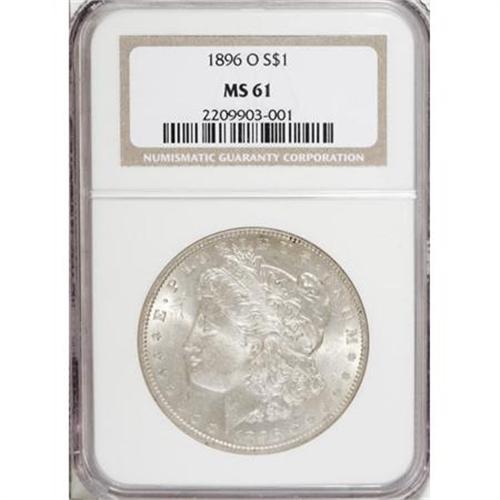 <B>1896-O $1 MS61 NGC.</B></I> Following a string of lower-mintage issues, New Orleans dollar production rebounded in 1896, with 4.9 million pieces coined. Delicate golden-tan patina graces the obverse of this luminous piece, while the reverse is silver-gray. Wispy abrasions in the fields and on the devices account for the grade.<BR><BR><B>Coin Engraver:</B> George T. Morgan<BR><BR><b>Shipping:</b> Coins & Currency (<a target="_blank" href="http://www.heritageauctions.com/common/shipping.php">view shipping information</a>)