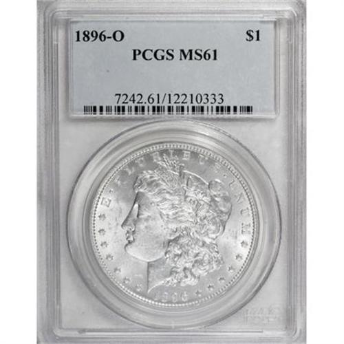 <B>1896-O $1 MS61 PCGS.</B></I> Always a challenge to locate in any grade of Uncirculated, this is a brilliant piece that shows the usual satiny mint luster. Well, but not fully struck in the centers, with the expected number of small abrasions, most of which are on the obverse.<BR><BR><B>Coin Engraver:</B> George T. Morgan<BR><BR><b>Shipping:</b> Coins & Currency (<a target="_blank" href="http://www.heritageauctions.com/common/shipping.php">view shipping information</a>)