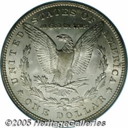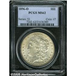 <B>1896-O<img border='0' src='http://www.heritagecoins.com/images/star.gif' width=10 height=10>$1 MS62 PCGS.</B></I> Brilliant and lustrous with satiny silver surfaces and pale champagne toning. This is a lovely example for the grade, and is certain to be a welcome addition to almost any collection.