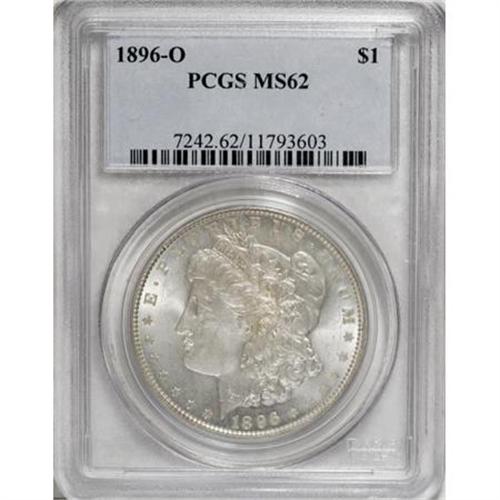 <B>1896-O $1 MS62 PCGS.</B></I> The lustrous surfaces are silver-white with a touch of highpoint gold on this difficult O-mint issue. Gem examples of the 1896-O are extremely rare, and even the Mint State pieces are plagued with surface abrasions and other quality problems. This piece shows a couple of prominent reeding marks on the cheek and lower neck, but elsewhere they are relatively distraction-free, particularly on the reverse, which appears choice for the grade. <BR><BR><B>Coin Engraver:</B> George T. Morgan<BR><BR><b>Shipping:</b> Coins & Currency (<a target="_blank" href="http://www.heritageauctions.com/common/shipping.php">view shipping information</a>\)