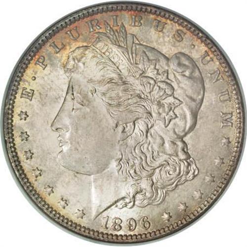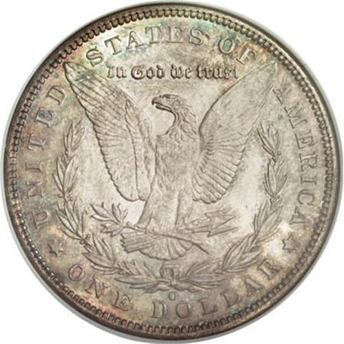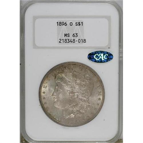<B>1896-O $1 MS63 NGC. CAC.</B></I> Creamy luster and a coat of attractive, pinkish-gray coloration covers both sides. This Select Mint State example also displays lovely gold, blue-gray, and pale green iridescence near the borders. With few marks, and showing typical weakness on the hair detail just above Liberty's ear, this piece is a good representative for the MS63 grade. Exceedingly scarce any finer, with a mere 15 coins presently certified above MS63, by NGC (2/08). <BR><BR><B>Coin Engraver:</B> George T. Morgan<BR><BR><b>Shipping:</b> Coins & Currency (<a target="_blank" href="http://www.heritageauctions.com/common/shipping.php">view shipping information</a>)