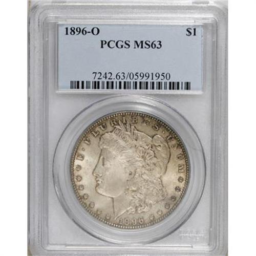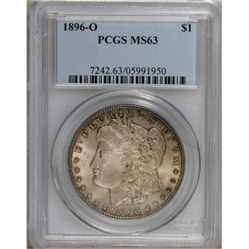 <B>1896-O $1 MS63 PCGS.</B></I> Noted silver dollar expert Wayne Miller once commented, regarding the 1896-O, that no other Morgan dollar issue is as consistently deficient in terms of strike, luster, and surface preservation. The current offering is attractive, however, with obviously original surfaces that display bits of speckled patina near the borders. The luster is satiny and the striking details are a bit soft, but, other than a couple of ticks on Liberty's nose and chin, neither side reveals any distracting marks or abrasions.<BR><BR><B>Coin Engraver:</B> George T. Morgan<BR><BR><b>Shipping:</b> Coins & Currency (<a target="_blank" href="http://www.heritageauctions.com/common/shipping.php">view shipping information</a>\)