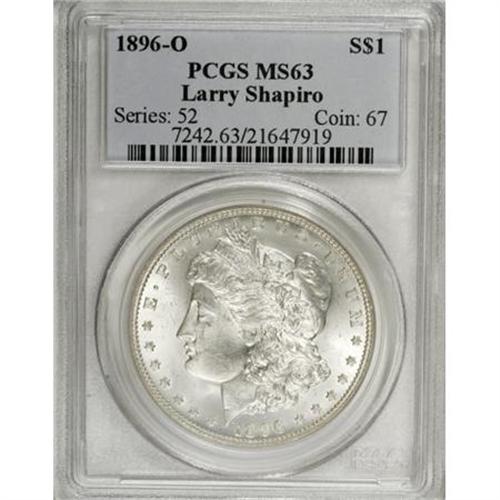 <B>1896-O $1 MS63 PCGS.</B></I> Ex: Larry Shapiro Collection. Many numismatists contend that the typical 1896-O dollar comes with considerable problems. Wayne Miller, for example, in his Morgan and Peace dollar reference, says: " No other Morgan dollar is as consistently deficient in luster, strike, and degree of surface abrasions as the 1896-O." The Select coin in this lot digresses significantly from Miller's profile. Its untoned surfaces are fully lustrous, and exhibit sharp definition on most of the design elements. The hair over Liberty's ear is weak, but fairly good detail is apparent on the eagle's breast. The reverse is quite well preserved, while a few marks on Liberty's cheek and neck preclude a higher grade. All in all, a nice example for the issue and the grade.<BR><I>From The Arnold & Harriet Collection, Part Two.</B></I><BR><BR><B>Coin Engraver:</B> George T. Morgan<BR><BR><b>Shipping:</b> Coins & Currency (<a target="_blank" href="http://www.heritageauctions.com/common/shipping.php">view shipping information</a>)