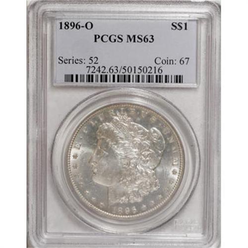 <B>1896-O $1 MS63 PCGS.</B></I> This flashy example has terrific luster and just a bit of light golden color on each side. Scattered minor marks define and limit the grade, but the strike is bolder than usually seen and the overall eye appeal certainly approaches Choice.<BR><I>From The Motor City Collection.</B></I><BR><BR><B>Coin Engraver:</B> George T. Morgan<BR><BR><b>Shipping:</b> Coins & Currency (<a target="_blank" href="http://www.heritageauctions.com/common/shipping.php">view shipping information</a>)