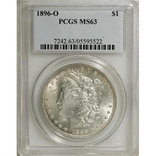 <B>1896-O $1 MS63 PCGS.</B></I> In 1896, the Philadelphia Mint produced many silver dollars, and examples are common today. Similarly, the New Orleans Mint produced a large quantity, nearly 5 million, but almost all of them entered circulation. Mint State pieces were not hoarded in Treasury Vaults, and examples are rare today. This is a delightful piece with satiny silver luster, full brilliance, and a trace of peripheral toning.<BR><I>From The Jimmy G. PCGS Registry Collection of Morgan Dollars with Varieties.</B></I><BR><BR><B>Coin Engraver:</B> George T. Morgan<BR><BR><b>Shipping:</b> Coins & Currency (<a target="_blank" href="http://www.heritageauctions.com/common/shipping.php">view shipping information</a>)