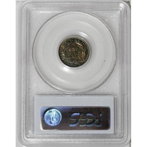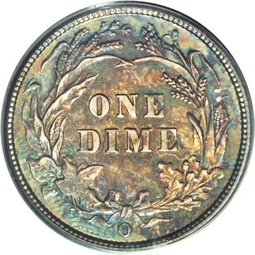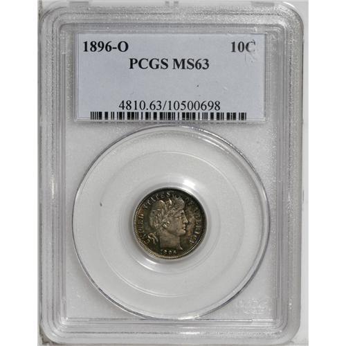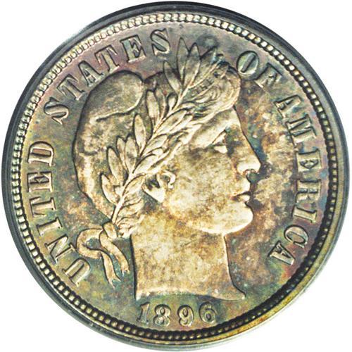 <B>1896-O<10C> MS63 PCGS.</B></I> The 1894 through 1897 New Orleans Barber dimes each saw limited mintages of less than three-quarters of a million coins, and all are scarce in Mint State today. This delightfully original piece shows mottled russet, amber, aqua, and gold toning over both sides. A couple of small contact marks on Liberty's face and neck seemingly preclude a higher grade. There is a die line through the right side of the O in ONE, as made. Population: 5 in 63, 23 finer (7/06).