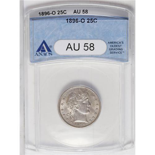 <B>1896-O<25C> AU58 ANACS.</B></I> Nearly mark-free with pastel gold and lilac hues over both sides and the slightest evidence of wear on the highpoints. Very appealing and as such representing solid collector value.