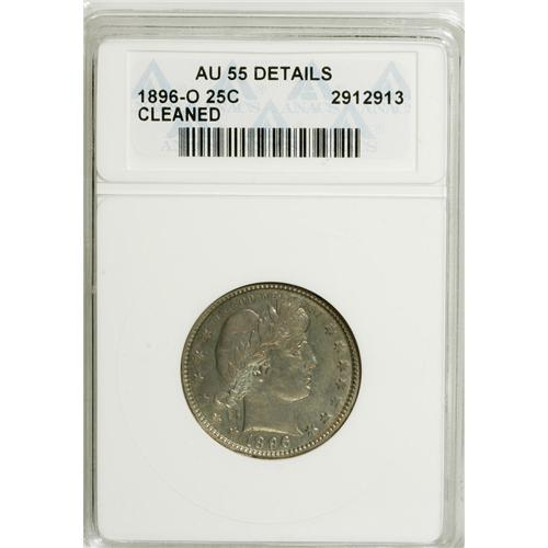 <B>1896-O 25C --Cleaned--ANACS. AU55 Details.</B></I> NGC Census: (2/42). PCGS Population (7/42). Mintage: 1,484,000. Numismedia Wsl. Price: $590. (#5614)<BR><BR><b>Shipping:</b> Coins & Currency (<a target="_blank" href="http://www.heritageauctions.com/common/shipping.php">view shipping information</a>)