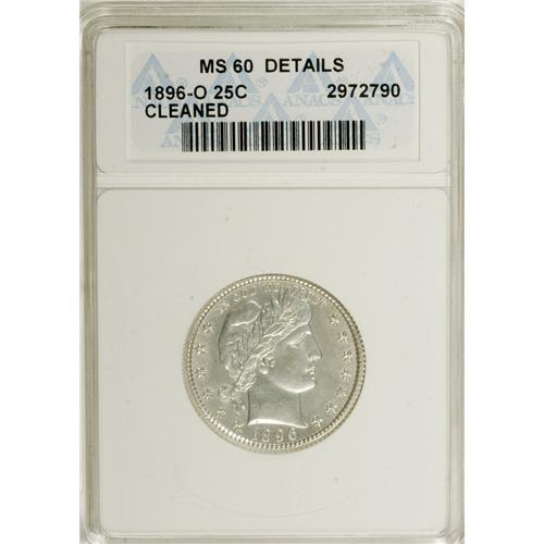 <B>1896-O 25C --Cleaned--ANACS. MS60 Details.</B></I> NGC Census: (4/72). PCGS Population (0/34). Mintage: 1,484,000. Numismedia Wsl. Price for NGC/PCGS coin in MS60: $825. (#5614)<BR><BR><b>Shipping:</b> Coins & Currency (<a target="_blank" href="http://www.heritageauctions.com/common/shipping.php">view shipping information</a>)