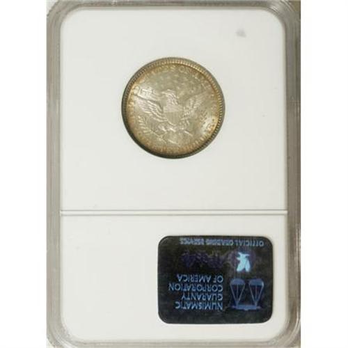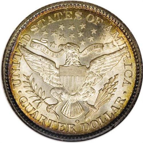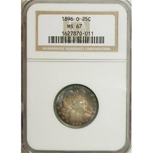 <B>1896-O 25C MS67 NGC.</B></I> This Superb Gem is a memorable coin that represents one of the classic key-dates in the Barber quarter series. While most collectors, novice and advanced, recognize the 1896-S as the important rarity in the series, its New Orleans Mint cousin is every bit as elusive in top condition, especially with a full strike.<BR> Nearly every design feature is boldly rendered, including the star details and all of the hair strands on the obverse and the eagle details on the reverse. Only the arrow feathers near the eagle's claw show slight weakness. Each side of this coin has impeccable surfaces with only minuscule impediments on Liberty's cheek. The central obverse and reverse have creamy luster with peripheral gold, magenta, and blue on the obverse and a ring of light gold on the reverse. Census: 1 in 67, 1 finer (6/07).<BR><I>From The Belle Glade Collection, Part Two.</B></I><BR><BR><B>Coin Engraver:</B> Charles E. Barber<BR><BR><b>Shipping:</b> Coins & Currency (<a target="_blank" href="http://www.heritageauctions.com/common/shipping.php">view shipping information</a>\)