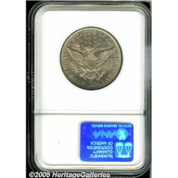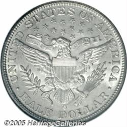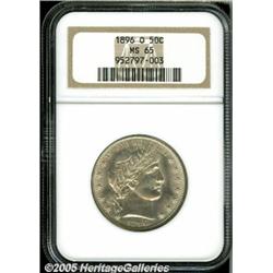 <B>1896-O 50C MS65 NGC.</B></I> The 1896-O half is an issue that is known to most numismatists who are vaguely familiar with 19th century numismatics. While the mintage was not all that low with 924,000 pieces produced, it has a very low availability as grades increase. It is especially challenging in mint condition, and David Lawrence rated it an R.6 in Uncirculated grades. Only three Gems have been certified by NGC with two finer, while PCGS has graded three MS65s with three others finer (2/05). This is an absolutely splendid coin whose most impressive feature may well be its mint luster. New Orleans coins are known for satiny finishes, but this is somewhat different with a hard, metallic sheen that rolls around each side as the coin is tilted beneath a light. The obverse is fully struck, while the reverse displays the usual softness of detail on the right (facing) side of the eagle. Lightly toned on each side and very nicely balanced in appearance on both obverse and reverse.