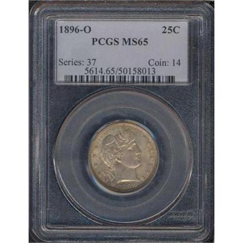 <b>1896-O Barber Quarter Dollar. PCGS graded MS65.</b> Dusky original toning. One of the unsung grade rarities in the Barber quarter series from a low mintage of just 1,484,000 pieces. This is among the nicest Gem 65 survivors from a small population of mint state coins. The surfaces are fully detailed and frosty underneath the color, best of all, mostly free marks, being draped in attractive natural patina. Both the originality and gem status of this rare issue are plain as the nose on your face <b>(PCGS # 5614)</b> <i>