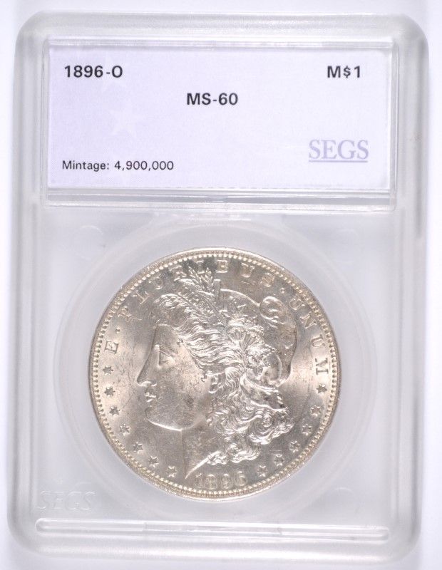 1896-O MORGAN SILVER DOLLAR, SEGS MS-60 RARE!