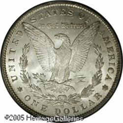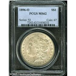 <B>1896-O<img border='0' src='http://www.heritagecoins.com/images/star.gif' width=10 height=10>$1 MS62 PCGS.</B></I> Toned with tawny gray over luster on the obverse while the reverse has a touch of gold intermixed in the peripheral lettering. A scarce date to find in any grade of Mint State. Lot:10496