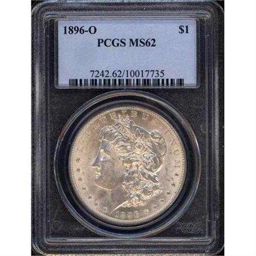 <b>1896-O Morgan Dollar. PCGS graded MS62.</b> A satiny O-mint issue of the most advantageous order for a collector who aspires to own this year in Mint condition (seldom offered). Its high degree of broad-spinning cartwheel luster pulses gently from side to side. Neither flashy nor dull, it is just the right in-between composition to entice bidders. Nicely struck, too, with just a small amount of weakness at the usual Achilles' heel on the hair above the ear at center <b>(PCGS # 7242)</b>