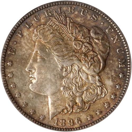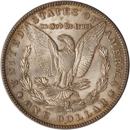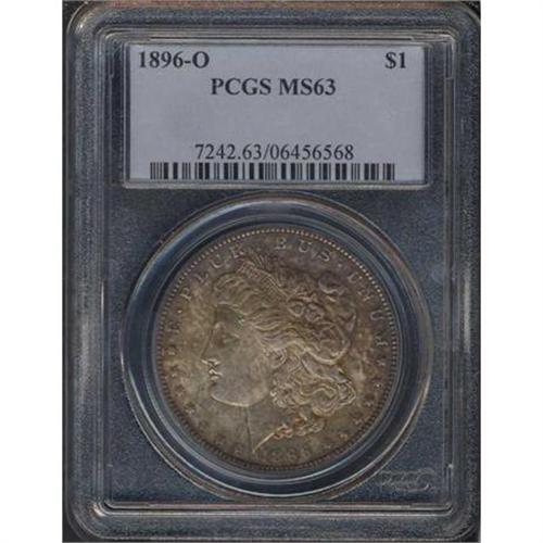 <b>1896-O Morgan Dollar. PCGS graded MS63.</b> This lovely choice Mint State example is finished in satin luster with warmly toned fields on both sides, and no problems to report. 1896-O dollars tend to be poorly struck compared to the S-mint issues the same year; an example with good detail is almost never seen. As it is, this choice MS63 suffers no bothersome heavy abrasions or points of wear; but the dies left modest weakness or imprecision in the topmost hair curls at the ear, and insufficient feather sharpness on the chest of the eagle <b>(PCGS # 7242)</b>