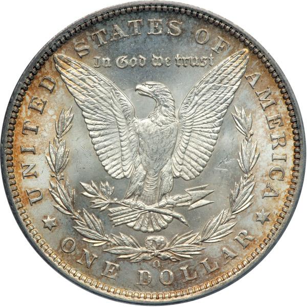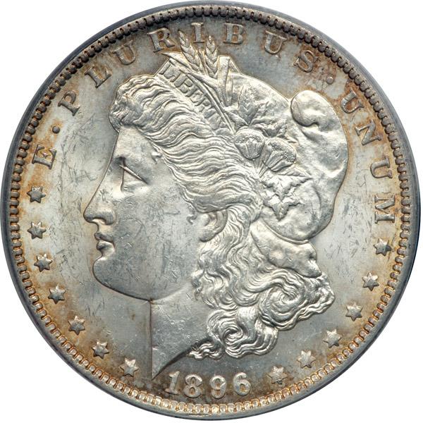 1896-O Morgan Dollar. PCGS graded MS-62 PQ. Scarce date in Mint State. Frosty with light golden toning around the edges. A few grazes in the frost at the left of Liberty and a small mark in the field right of the eagle. Wholly frosty, with the toning gripping the areas around the legends and stars for the most part, excluding Liberty, and on the reverse, slipping inwards a little closer in with its friendly warm golden glow. A well made example (PCGS # 7242) .