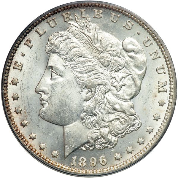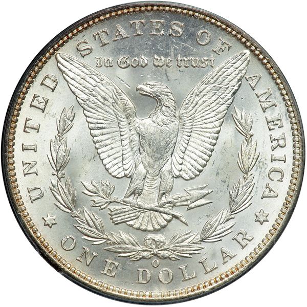 1896-O Morgan Dollar. PCGS graded MS-63. A beautiful, basically white frosty mint example with far fewer marks than usually associated with this numerical grade. Only a small mark is noted by the eagle's beak. Baking bright luster on satiny surfaces. A touch of weakness is seen at the hair above the ear, but here it is probably that the dies were spaced just far enough apart to prevent stronger metal flow in that area, noticeable on numerous O-mint issues in the Morgan series; the other obverse details, along with the reverse, are consistent with this choice grade. It seems very few Mint State 1896-O dollars were saved at the time of issue, either by individuals or by the government in its various Treasury and sub-treasuries as backing for the Silver Certificates. Most people East of the Rocky Mountains preferred paper money in lieu of the heavy silver coins. Westerners for the most part were "hard money" types well into the 20th century. Pop 264; 31 finer (PCGS # 7242) .