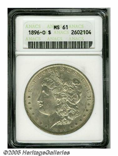 <B>1896-O<S$1> MS61 ANACS.</B></I> A sharply struck and satiny better date Silver Dollar that is comparatively unblemished for the MS61 grade. The high mintage 1896-O is readily available through XF grades, but is scarce in AU and becomes desirable in Uncirculated condition. Gems are virtually unobtainable.
