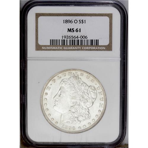 <B>1896-O<img border='0' src='http://www.heritagecoins.com/images/star.gif' width=10 height=10>$1> MS61 NGC.</B></I> Essentially untoned with subdued, satiny brilliance and a lack of serious abrasions. An affordable Mint State example of the conditionally elusive O-mint Morgan. <BR><BR><B>Important notice:</B> Heritage usually auctions material at the rate of 200-250 lots per hour. On some occasions eBay Live bid software or the Internet may not be able to keep up with the pace of the auction. We recommend placing a realistic absentee bid now as insurance to avoid disappointment. Occasionally the auctioneer may eliminate or reject an eBay Live bid, and the auctioneer may also reopen a lot after the close of the eBay live bidding (usually because we missed an audience bid), and may reject your bid even if it shows you as the winning bidder. By bidding via eBay Live, you agree that Heritage may award the lot to another bidder at its sole discretion under the circumstances described above or any other reasonable circumstances. Since eBay bids are not shown to us until we open the lot on the floor, we treat those bids just like floor bids. In most cases the floor responds before the eBay bid is presented to us, due to Internet lag time, so for consistency we have made it a policy that floor bids are always considered first over tie eBay live bids. Also please note that all Heritage lots purchased through eBay Live carry a 20% Buyer's Premium. Please make sure you read the Terms and Conditions before you bid. This lot is being auctioned in conjunction with a live floor auction by Heritage Galleries & Auctioneers. All final auction and invoice information will be supplied by Heritage Galleries & Auctioneers, and all other information should be considered preliminary. Lot:3702 <BR><BR><B>Winning Notification and Billing:</B> After the FINAL session in this auction is complete, Heritage will send e-mail and snail mail invoices. This process normally takes several days. All final auction and invoice information will be supplied by Heritage Galleries & Auctioneers, and all other information should be considered preliminary. <BR><BR>This auction will be conducted on a live auction floor and over the Internet through eBay Live. If you choose to place an absentee bid, please take a moment to <font color='#0000ff'><u><a href='http://pages.ebay.com/liveauctions/help/before/laabsentee.html'>learn how eBay Live absentee bidding works</a></u></font><font color='#000000'>