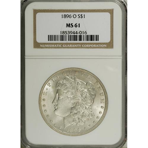 <B>1896-O S$1 MS61 NGC.</B></I> The glowing satiny sheen across both sides is perhaps the most noticeable attribute of this Mint State silver dollar. The striking quality and the number of surface marks seem typical for the issue and the grade level. Essentially untoned and attractive.<BR><I>From The Twin Hollows Collection, Part Two.</B></I><BR><BR><b>Shipping:</b> Coins & Currency (<a target="_blank" href="http://www.heritageauctions.com/common/shipping.php">view shipping information</a>)