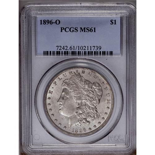 <B>1896-O<img border='0' src='http://www.heritagecoins.com/images/star.gif' width=10 height=10>$1> MS61 PCGS.</B></I> One of the more difficult Morgan dollars in Mint State, this coin is untoned and shows only superficial abrasions. The luster presents a brighter silver-gray appearance than is normal for New Orleans minted dollars of the early and mid-1890s. A bit softly struck in the centers, as usual.