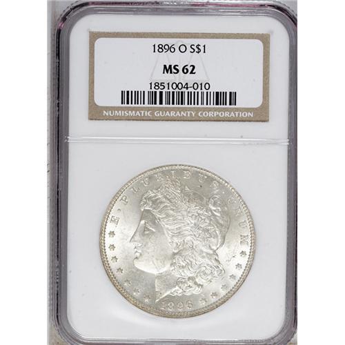 <B>1896-O<img border='0' src='http://www.heritagecoins.com/images/star.gif' width=10 height=10>$1> MS62 NGC.</B></I> This issue is among the most troublesome to find in attractive Mint State. This piece is nicely struck and each side has better-than-average luster, though the reverse is stronger. Hazy golden-brown patina covers parts of the obverse, and the usual bagmarks are much smaller and fewer than the norm.