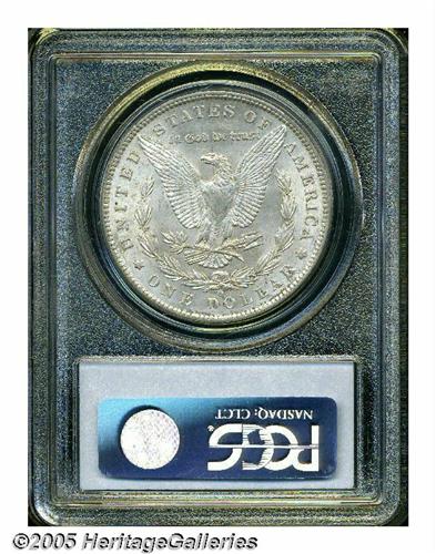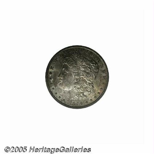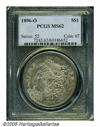 <B>1896-O<S$1> MS62 PCGS.</B></I> Subdued luster. The obverse has dusky gray toning with golden-brown and gunmetal blue iridescent highlights. The reverse is essentially brilliant with just a whisper of pewter gray. Most design features are sharp save for a touch of softness on the eagle's breast and above Liberty's ear. The 1896-O is typically only available in low grades; indeed, it is considered to be a scarcity even at the AU50 grade level. Examples grading MS60 or finer always command generous bids when they cross the auction block.