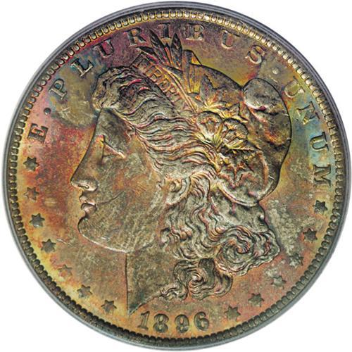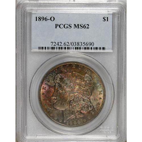 <B>1896-O S$1 MS62 PCGS.</B></I> The 1896-O is a curious issue that is essentially available in whatever price range one wishes. Tons of coins are available in circulated condition. Uncirculated pieces are genuinely scarce and are increasingly difficult and expensive as one looks up the grading scale. This is a satiny example that has attractive multicolored toning on the obverse and a brilliant reverse. Close examination reveals a number of small abrasions on the obverse that account for the grade. Above average strike.<BR><BR><b>Shipping:</b> Coins & Currency (<a target="_blank" href="http://www.heritageauctions.com/common/shipping.php">view shipping information</a>)
