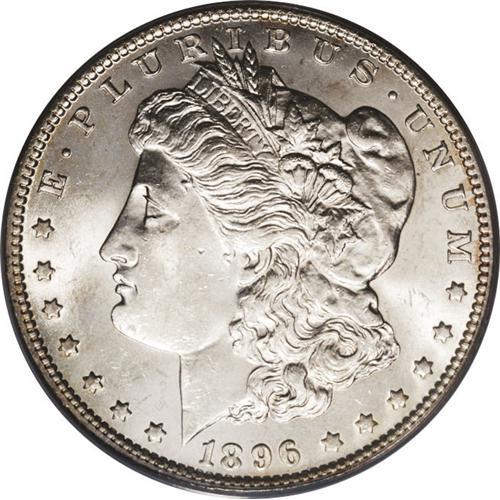 <B>1896-O<img border='0' src='http://www.heritagecoins.com/images/star.gif' width=10 height=10>$1> MS63 PCGS.</B></I> Basically untoned with decent sharpness for this conditionally scarce O-mint and only modest abrasions on the central devices. The satiny fields are virtually unaffected by contact.