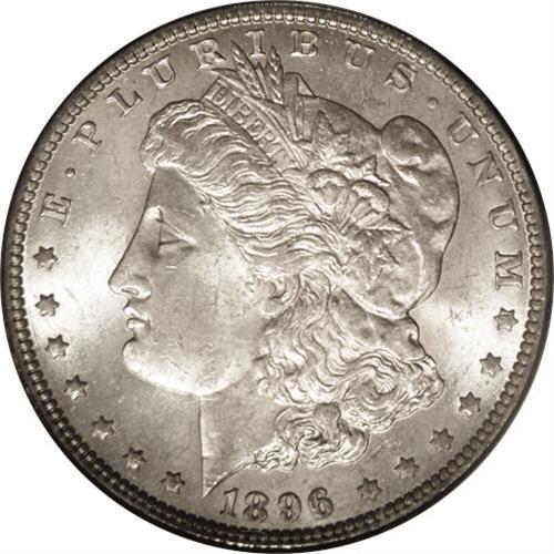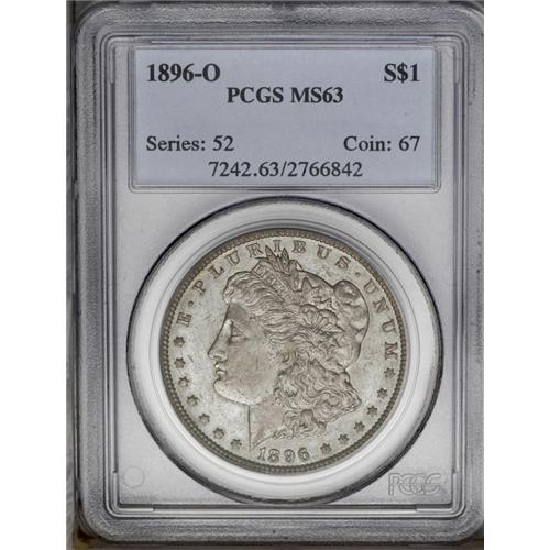 <B>1896-O<img border='0' src='http://www.heritagecoins.com/images/star.gif' width=10 height=10>$1> MS63 PCGS.</B></I> The 1896-O dollar is quite common in circulated grades. Mint State pieces are readily available through MS62, but become more challenging in MS63. A precipitous drop in the certified population occurs in near-Gem and finer grades, where fewer than 40 specimens have been seen by PCGS and NGC (4/06). This MS63 coin is somewhat better struck that most examples of the issue, with partial definition apparent in the hair over Liberty's ear and on the eagle's breast feathers. Lightly toned surfaces possess average luster, and reveal a few small contact marks over each side.
